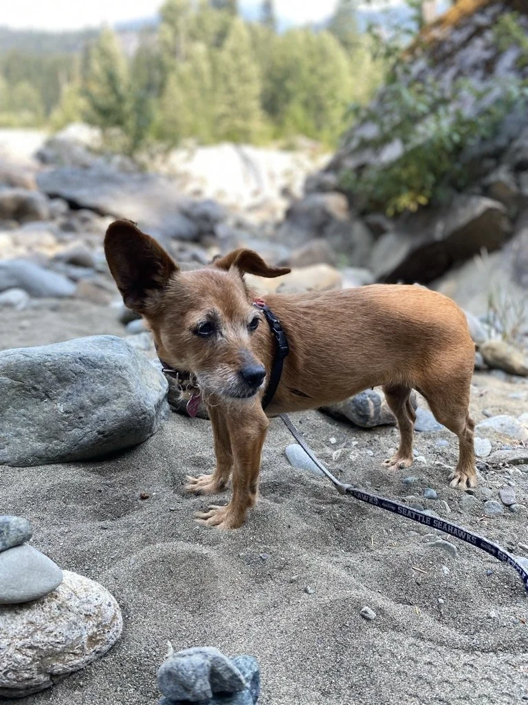She's a ten-pound, rescue Chi-Dach-Terrier mix. She is with me in the office most days. Sometimes she's curled up on her mat, or she may come to be with you on the couch. She's always ready to get a treat.
